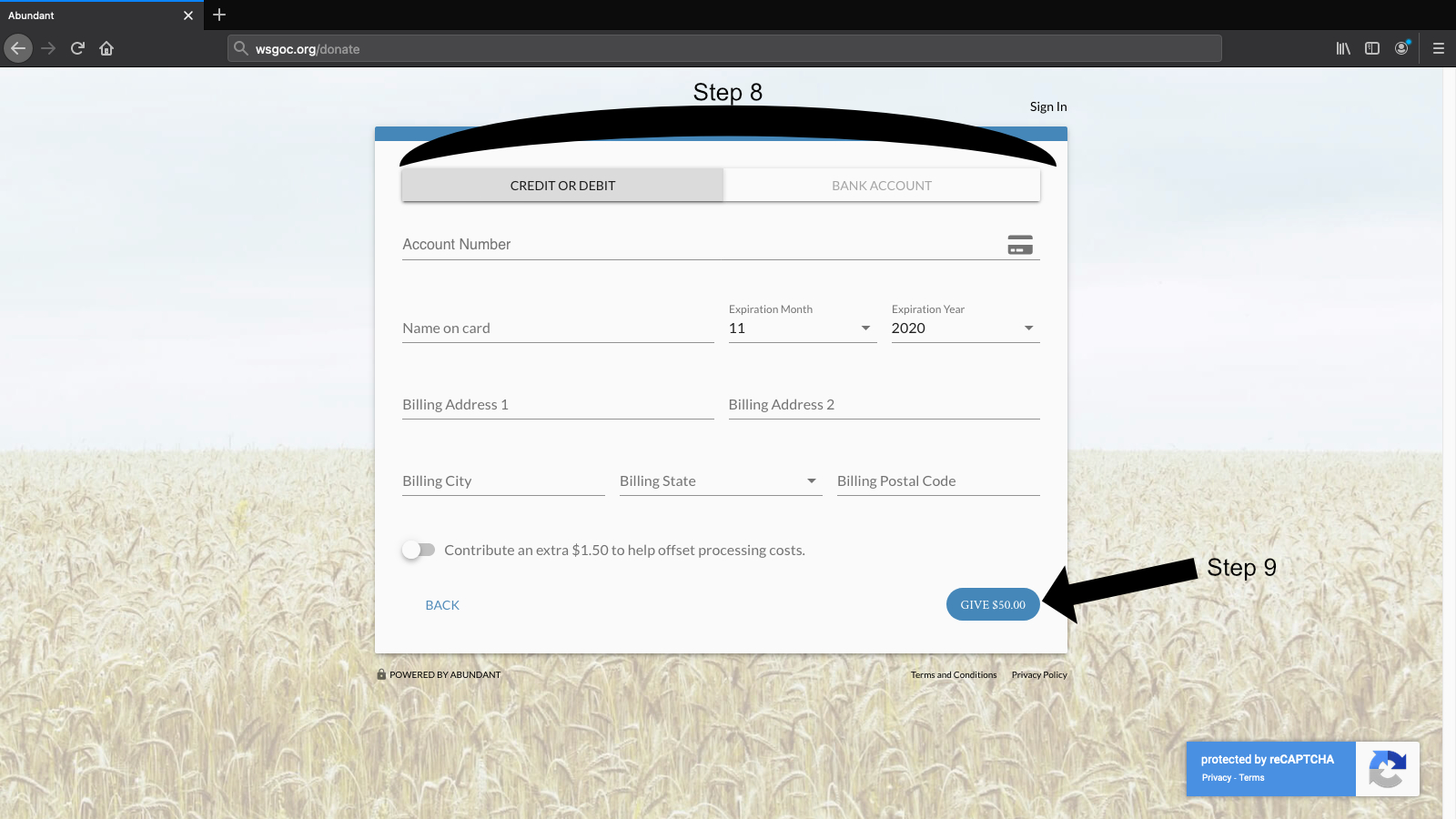 After filling in your payment information, you can click "Give" to begin the processing of your donation.